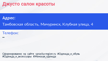 Джусто, салон красоты по адресу Тамбовская область, Мичуринск, Клубная улица, 4 в дальнейшем Организация, размещена в следующих категориях: