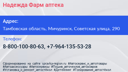Надежда-Фарм, аптека по адресу Тамбовская область, Мичуринск, Советская улица, 290 в дальнейшем Организация, размещена в следующих категориях: