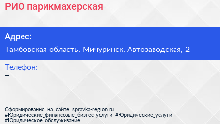 РИО, парикмахерская по адресу Тамбовская область, Мичуринск, Автозаводская, 2 в дальнейшем Организация, размещена в следующих категориях: