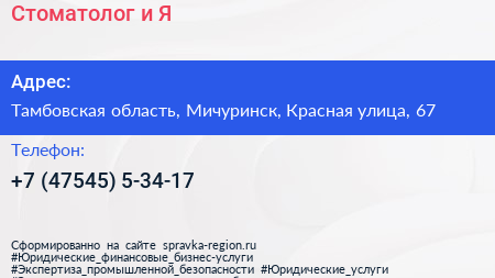 Стоматолог и Я по адресу Тамбовская область, Мичуринск, Красная улица, 67 в дальнейшем Организация, размещена в следующих категориях: