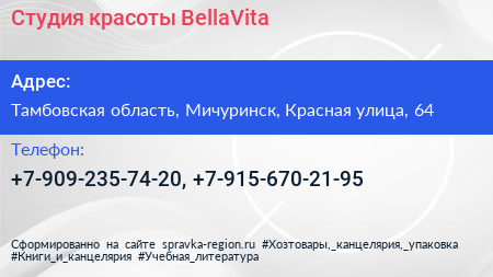 Студия красоты BellaVita по адресу Тамбовская область, Мичуринск, Красная улица, 64 в дальнейшем Организация, размещена в следующих категориях: