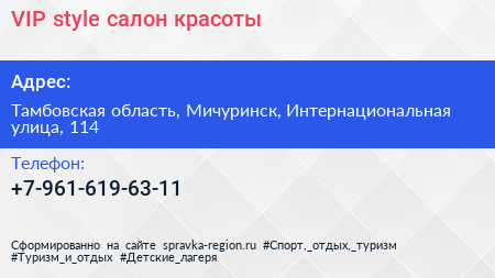 VIP style, салон красоты по адресу Тамбовская область, Мичуринск, Интернациональная улица, 114 в дальнейшем Организация, размещена в следующих категориях: