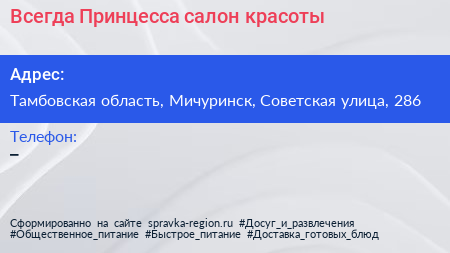 Всегда Принцесса, салон красоты по адресу Тамбовская область, Мичуринск, Советская улица, 286 в дальнейшем Организация, размещена в следующих категориях: