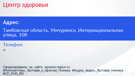 Центр здоровья по адресу Тамбовская область, Мичуринск, Интернациональная улица, 108 в дальнейшем Организация, размещена в следующих категориях: