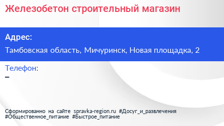 Железобетон, строительный магазин по адресу Тамбовская область, Мичуринск, Новая площадка, 2 в дальнейшем Организация, размещена в следующих категориях: