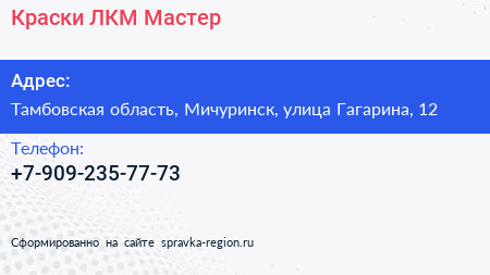 Краски ЛКМ Мастер по адресу Тамбовская область, Мичуринск, улица Гагарина, 12 в дальнейшем Организация, размещена в следующих категориях: