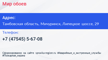 Мир обоев по адресу Тамбовская область, Мичуринск, Липецкое шоссе, 29 в дальнейшем Организация, размещена в следующих категориях: