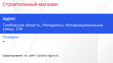 Строительный магазин по адресу Тамбовская область, Мичуринск, Интернациональная улица, 136 в дальнейшем Организация, размещена в следующих категориях: