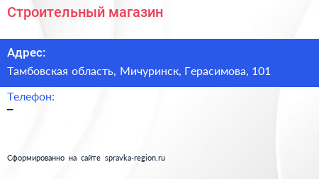 Строительный магазин по адресу Тамбовская область, Мичуринск, Герасимова, 101 в дальнейшем Организация, размещена в следующих категориях: