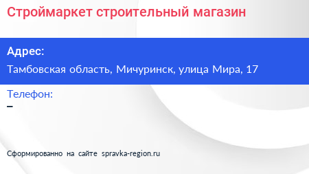 Строймаркет, строительный магазин по адресу Тамбовская область, Мичуринск, улица Мира, 17 в дальнейшем Организация, размещена в следующих категориях: