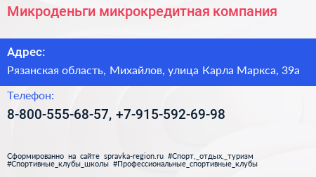 Микроденьги, микрокредитная компания по адресу Рязанская область, Михайлов, улица Карла Маркса, 39а в дальнейшем Организация, размещена в следующих категориях: