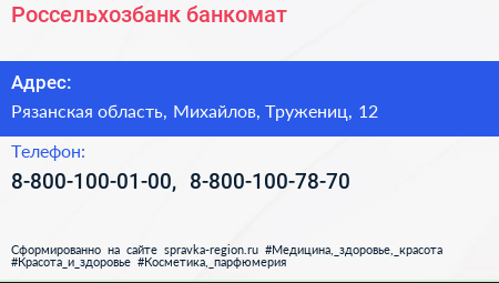 Россельхозбанк, банкомат по адресу Рязанская область, Михайлов, Тружениц, 12 в дальнейшем Организация, размещена в следующих категориях: