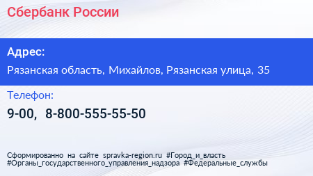 Сбербанк России по адресу Рязанская область, Михайлов, Рязанская улица, 35 в дальнейшем Организация, размещена в следующих категориях: