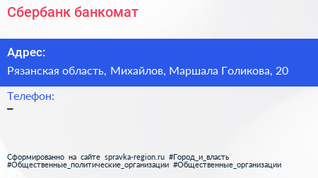 Сбербанк, банкомат по адресу Рязанская область, Михайлов, Маршала Голикова, 20 в дальнейшем Организация, размещена в следующих категориях: