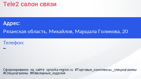 Tele2, салон связи по адресу Рязанская область, Михайлов, Маршала Голикова, 20 в дальнейшем Организация, размещена в следующих категориях: