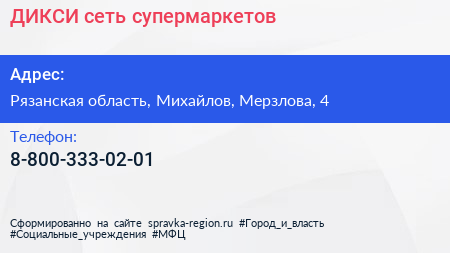 ДИКСИ, сеть супермаркетов по адресу Рязанская область, Михайлов, Мерзлова, 4 в дальнейшем Организация, размещена в следующих категориях: