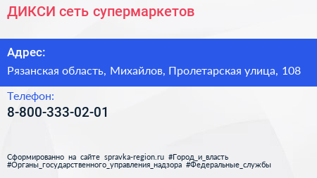 ДИКСИ, сеть супермаркетов по адресу Рязанская область, Михайлов, Пролетарская улица, 108 в дальнейшем Организация, размещена в следующих категориях: