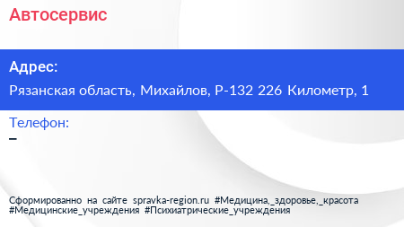 Автосервис по адресу Рязанская область, Михайлов, Р-132 226 Километр, 1 в дальнейшем Организация, размещена в следующих категориях: