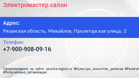 Электромастер, салон по адресу Рязанская область, Михайлов, Пролетарская улица, 2 в дальнейшем Организация, размещена в следующих категориях: