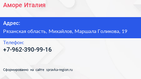 Аморе Италия по адресу Рязанская область, Михайлов, Маршала Голикова, 19 в дальнейшем Организация, размещена в следующих категориях: