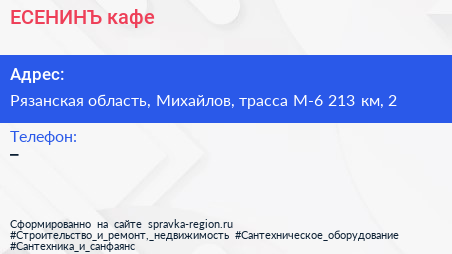 ЕСЕНИНЪ, кафе по адресу Рязанская область, Михайлов, трасса М-6 213 км, 2 в дальнейшем Организация, размещена в следующих категориях: