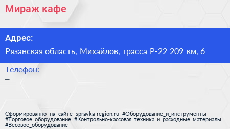 Мираж, кафе по адресу Рязанская область, Михайлов, трасса Р-22 209 км, 6 в дальнейшем Организация, размещена в следующих категориях: