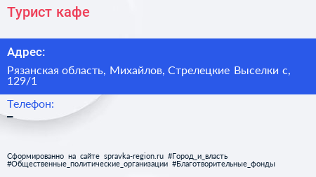 Турист, кафе по адресу Рязанская область, Михайлов, Стрелецкие Выселки с, 129/1 в дальнейшем Организация, размещена в следующих категориях: