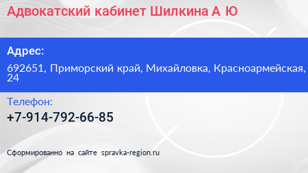 Адвокатский кабинет Шилкина А.Ю. по адресу 692651, Приморский край, Михайловка, Красноармейская, 24 в дальнейшем Организация, размещена в следующих категориях: