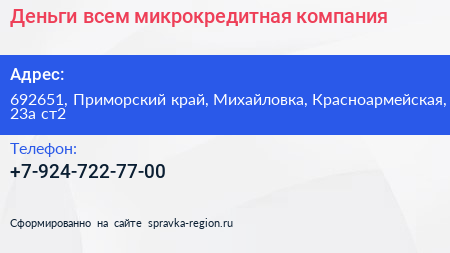Деньги всем!, микрокредитная компания по адресу 692651, Приморский край, Михайловка, Красноармейская, 23а ст2 в дальнейшем Организация, размещена в следующих категориях: