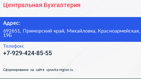 Центральная Бухгалтерия по адресу 692651, Приморский край, Михайловка, Красноармейская, 19Б в дальнейшем Организация, размещена в следующих категориях: