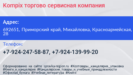 Kompix, торгово-сервисная компания по адресу 692651, Приморский край, Михайловка, Красноармейская, 28 в дальнейшем Организация, размещена в следующих категориях: