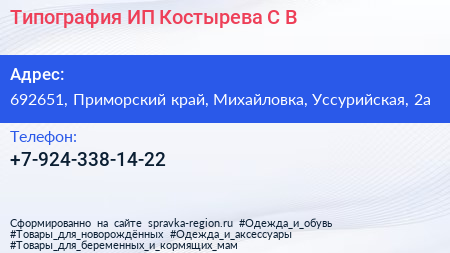 Типография, ИП Костырева С.В. по адресу 692651, Приморский край, Михайловка, Уссурийская, 2а в дальнейшем Организация, размещена в следующих категориях:
