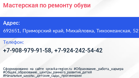 Мастерская по ремонту обуви по адресу 692651, Приморский край, Михайловка, Тихоокеанская, 52 в дальнейшем Организация, размещена в следующих категориях: