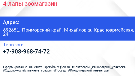 4 лапы, зоомагазин по адресу 692651, Приморский край, Михайловка, Красноармейская, 24 в дальнейшем Организация, размещена в следующих категориях:
