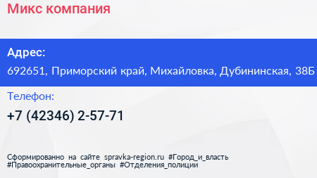Микс, компания по адресу 692651, Приморский край, Михайловка, Дубининская, 38Б в дальнейшем Организация, размещена в следующих категориях: