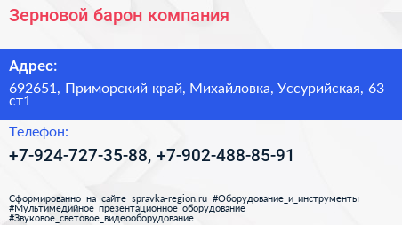 Зерновой барон, компания по адресу 692651, Приморский край, Михайловка, Уссурийская, 63 ст1 в дальнейшем Организация, размещена в следующих категориях: