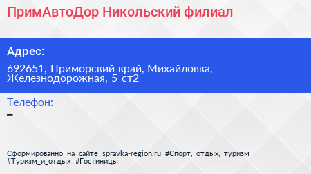 ПримАвтоДор, Никольский филиал по адресу 692651, Приморский край, Михайловка, Железнодорожная, 5 ст2 в дальнейшем Организация, размещена в следующих категориях: