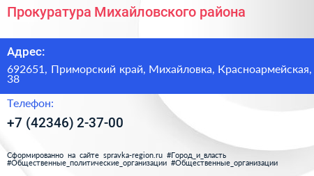Прокуратура Михайловского района по адресу 692651, Приморский край, Михайловка, Красноармейская, 38 в дальнейшем Организация, размещена в следующих категориях: