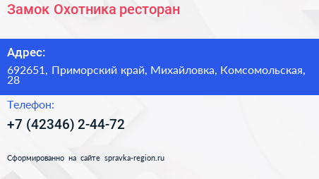 Замок Охотника, ресторан по адресу 692651, Приморский край, Михайловка, Комсомольская, 28 в дальнейшем Организация, размещена в следующих категориях: