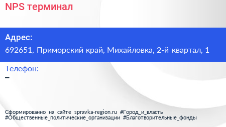 NPS, терминал по адресу 692651, Приморский край, Михайловка, 2-й квартал, 1 в дальнейшем Организация, размещена в следующих категориях: