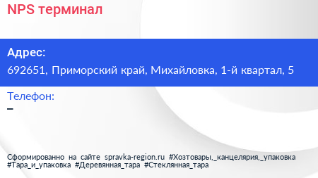 NPS, терминал по адресу 692651, Приморский край, Михайловка, 1-й квартал, 5 в дальнейшем Организация, размещена в следующих категориях: