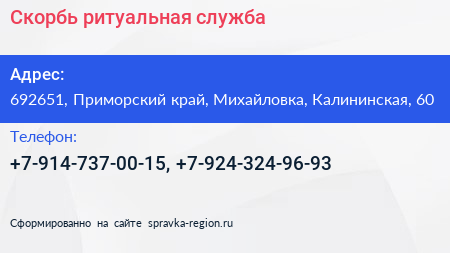 Скорбь, ритуальная служба по адресу 692651, Приморский край, Михайловка, Калининская, 60 в дальнейшем Организация, размещена в следующих категориях: