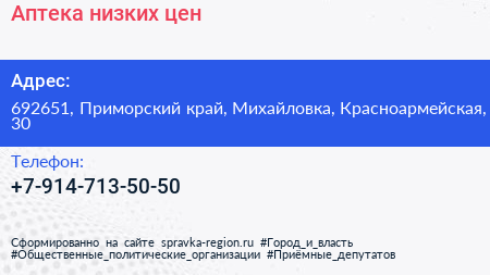 Аптека низких цен по адресу 692651, Приморский край, Михайловка, Красноармейская, 30 в дальнейшем Организация, размещена в следующих категориях:
