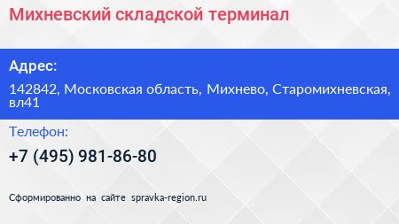 Михневский складской терминал по адресу 142842, Московская область, Михнево, Старомихневская, вл41 в дальнейшем Организация, размещена в следующих категориях:
