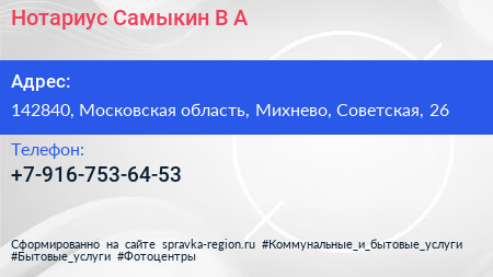 Нотариус Самыкин В.А. по адресу 142840, Московская область, Михнево, Советская, 26 в дальнейшем Организация, размещена в следующих категориях: