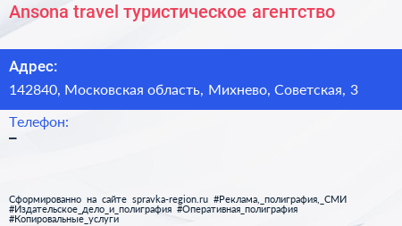 Ansona travel, туристическое агентство по адресу 142840, Московская область, Михнево, Советская, 3 в дальнейшем Организация, размещена в следующих категориях: