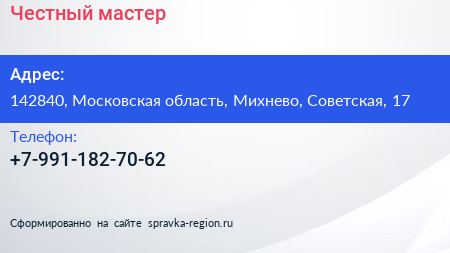 Честный мастер по адресу 142840, Московская область, Михнево, Советская, 17 в дальнейшем Организация, размещена в следующих категориях: