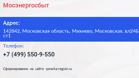 Мосэнергосбыт по адресу 142842, Московская область, Михнево, Московская, вл24Б ст1 в дальнейшем Организация, размещена в следующих категориях:
