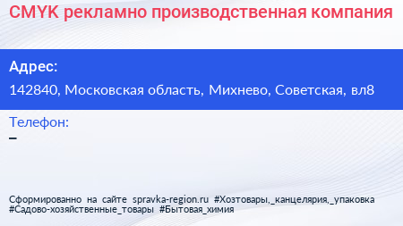 CMYK, рекламно-производственная компания по адресу 142840, Московская область, Михнево, Советская, вл8 в дальнейшем Организация, размещена в следующих категориях: