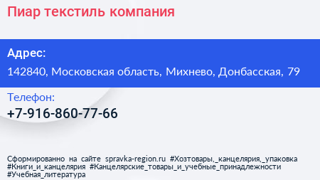 Пиар-текстиль, компания по адресу 142840, Московская область, Михнево, Донбасская, 79 в дальнейшем Организация, размещена в следующих категориях: